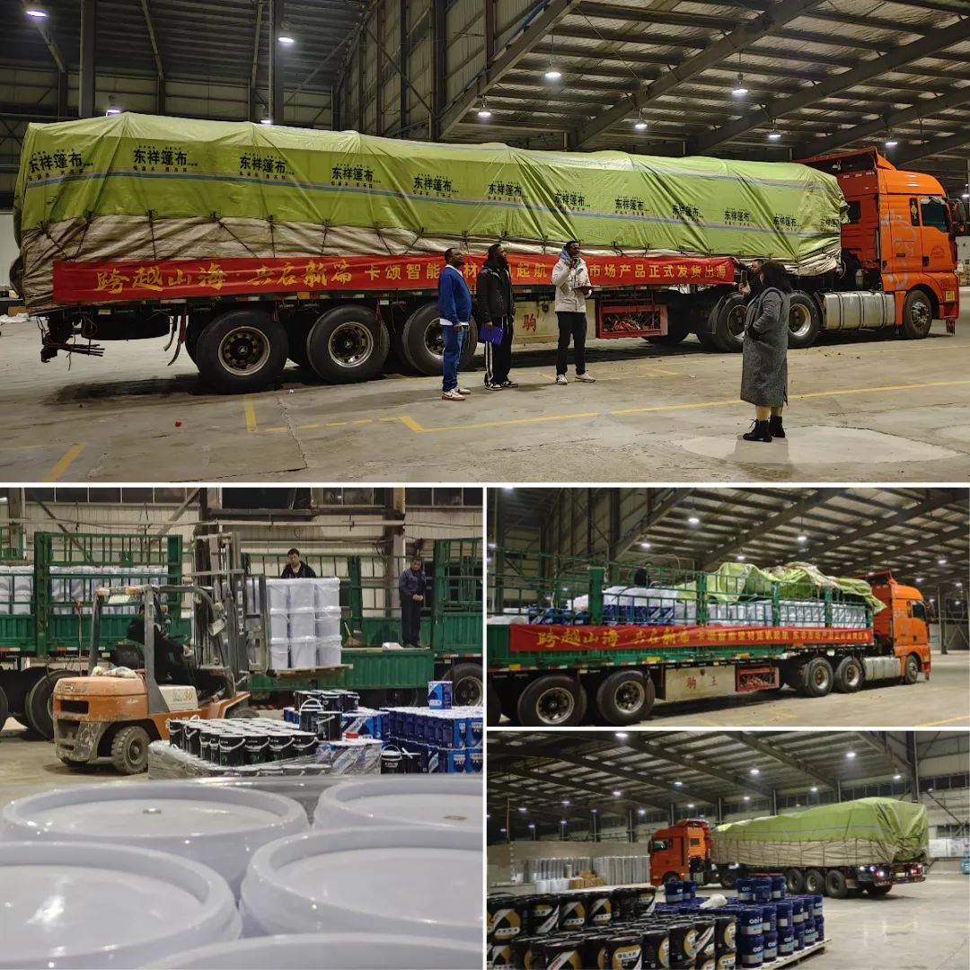 簽約儀式結(jié)束后,卡頌迅速投入到緊張的首批產(chǎn)品發(fā)貨籌備工作中。為了趕在春節(jié)前夕順利出關(guān)發(fā)貨,卡頌生產(chǎn)部團隊上下一心,日夜奮戰(zhàn),在公司領(lǐng)導(dǎo)的帶領(lǐng)下,嚴(yán)控生產(chǎn)品質(zhì),緊抓生產(chǎn)效率,經(jīng)過精心的準(zhǔn)備和嚴(yán)格的質(zhì)量把控,首批涵蓋卡頌內(nèi)墻水性涂料、卡頌內(nèi)墻干粉涂料、卡頌防水涂料等多個品種的產(chǎn)品順利裝車發(fā)貨。據(jù)悉,此次工廠到家跨境電商團隊對于卡頌產(chǎn)品的市場前景非常看好,并對其在東非市場的開拓充滿信心。第一批兩個貨柜的產(chǎn)品成功發(fā)出后,農(nóng)歷春節(jié)過后卡頌還將加快推進后續(xù)系列產(chǎn)品籌備與生產(chǎn),確保能持續(xù)不斷地為海外客戶提供符合當(dāng)?shù)厥袌鲂枨蟮膬?yōu)質(zhì)產(chǎn)品與服務(wù)。這些產(chǎn)品不僅代表著卡頌智能壁材的核心技術(shù)與優(yōu)勢,更承載著中國品牌對品質(zhì)的執(zhí)著追求和對國際市場的堅定信心。