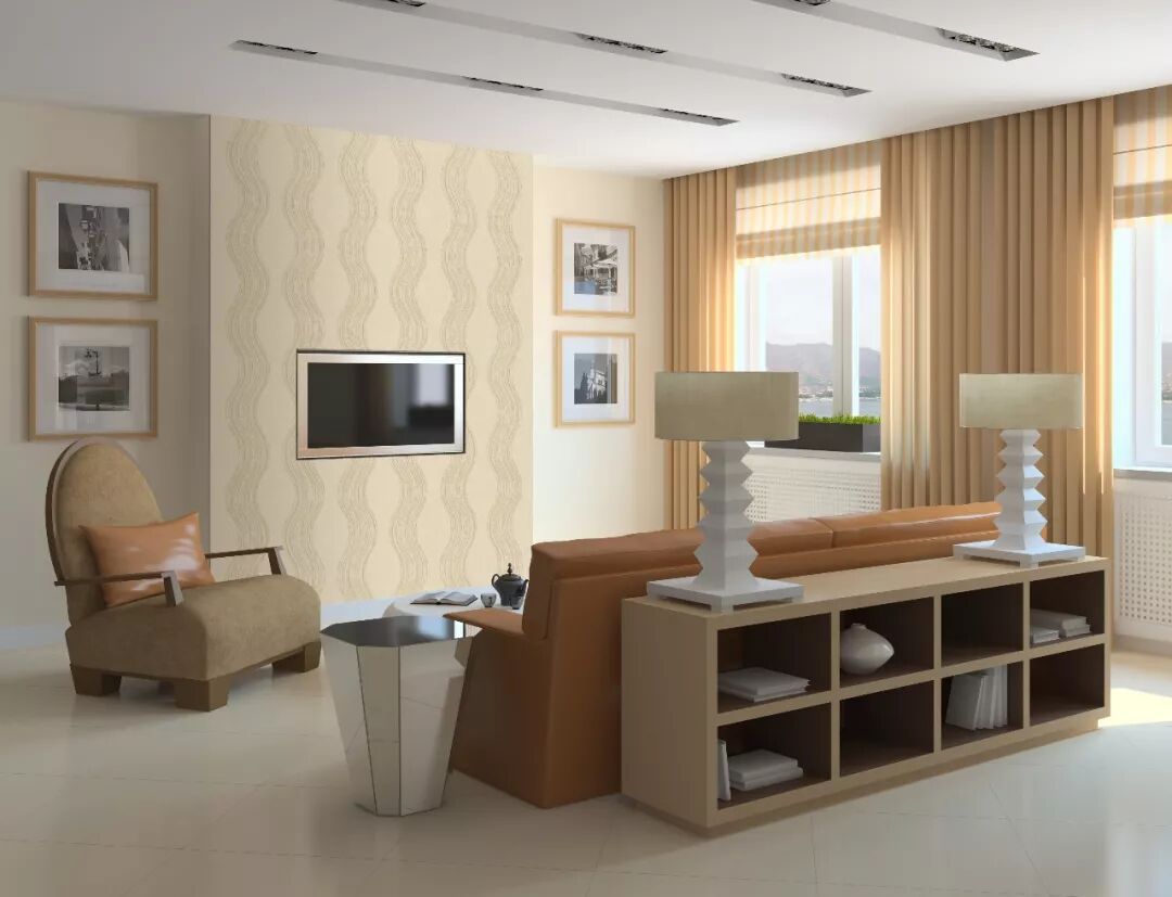 電視背景墻的水波紋與窗簾、燈柱輝映成趣,營造出靈動簡潔的空間。